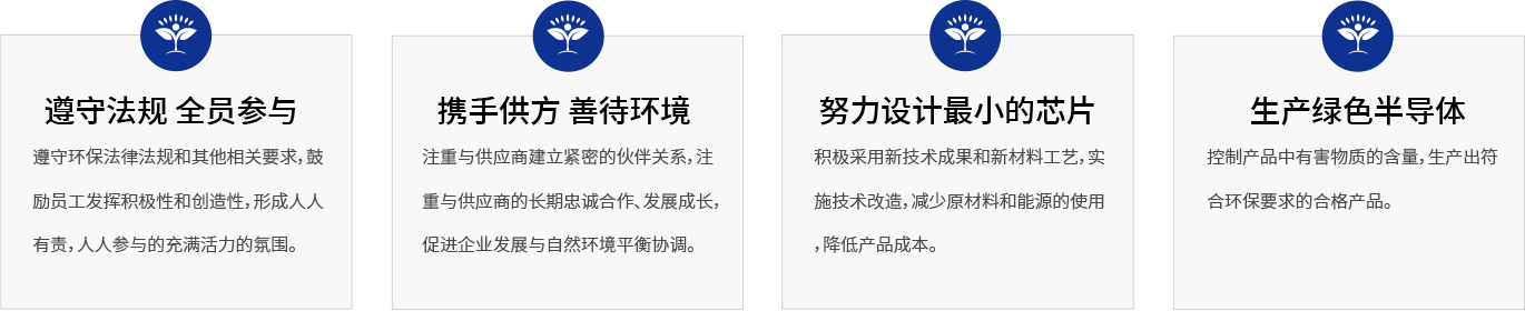 致力于保护环境,遵守环保法律法规和相关要求,提供安全健康的工作场所,在整个供应链环节促进保护环境,维持可持续发展 continued growth。虹安微电子的产品始终符合 ROHS 标准,REACH 法规等环保要求并从设计和工艺改进出发致力于降低能耗和原材料的使用。